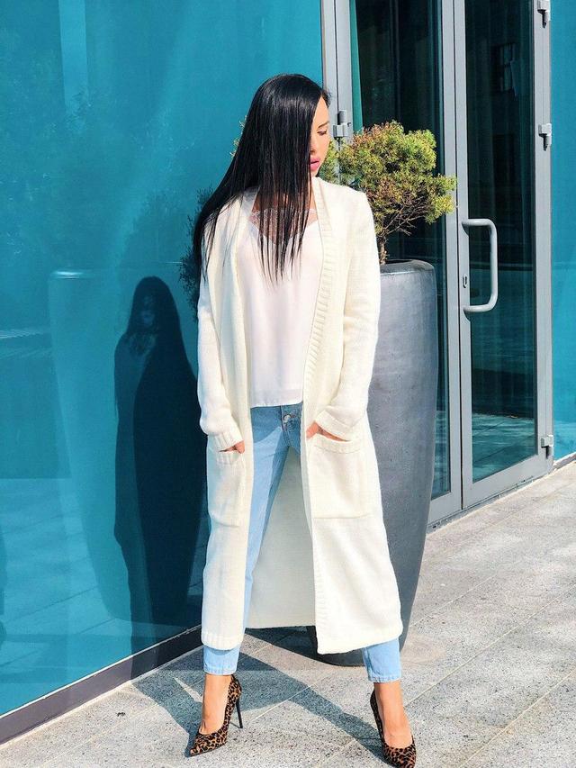 Довгий кардиган гладкого в'язання з об'ємними накладними кишенями.