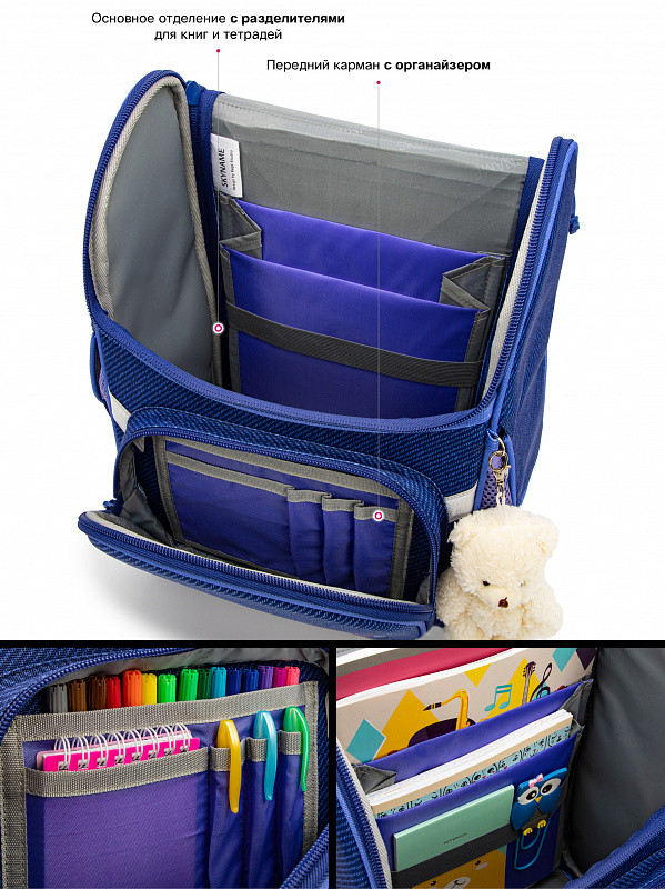 На передній частині ранця розташована кишеня на блискавці, прикрашена об'ємною 3D-карткою.