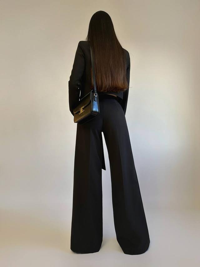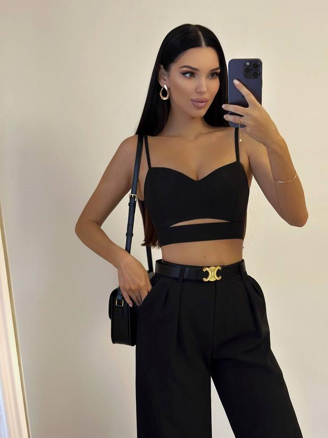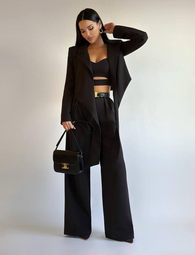 Розкішний костюм брюки. Оригінальний піджак на зав'язці, топ на тонких бретельках з плетінням та розкльошені штани. Топ позаду на блискавці, бретелі регулюються.