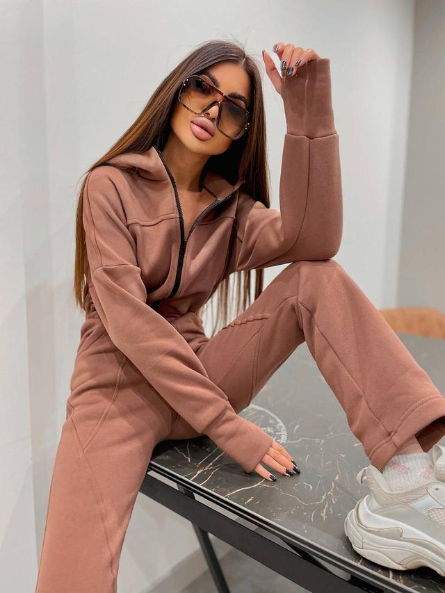 Теплий жіночий комбінезон з капюшоном та рукавами мітенками Dv5389