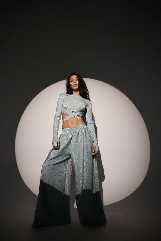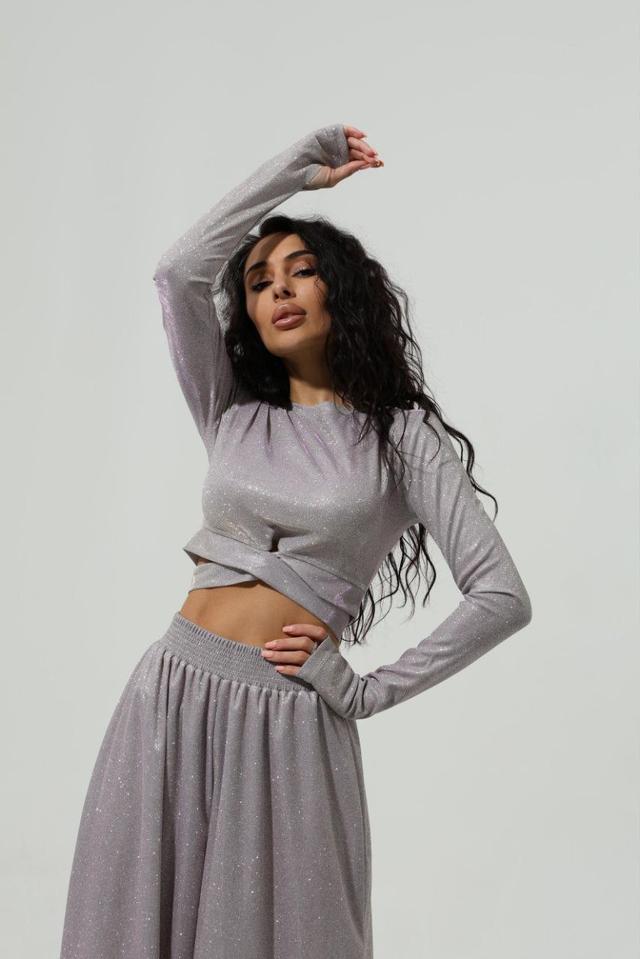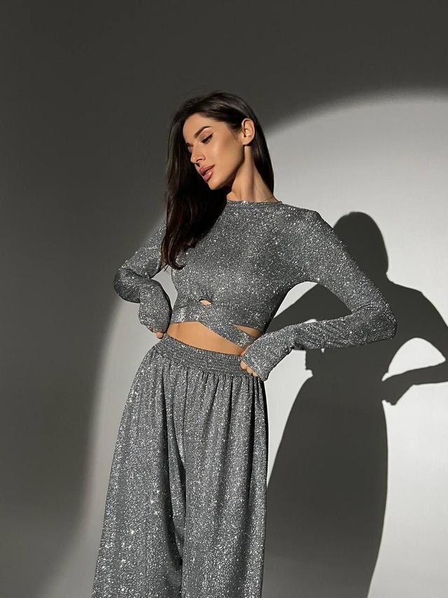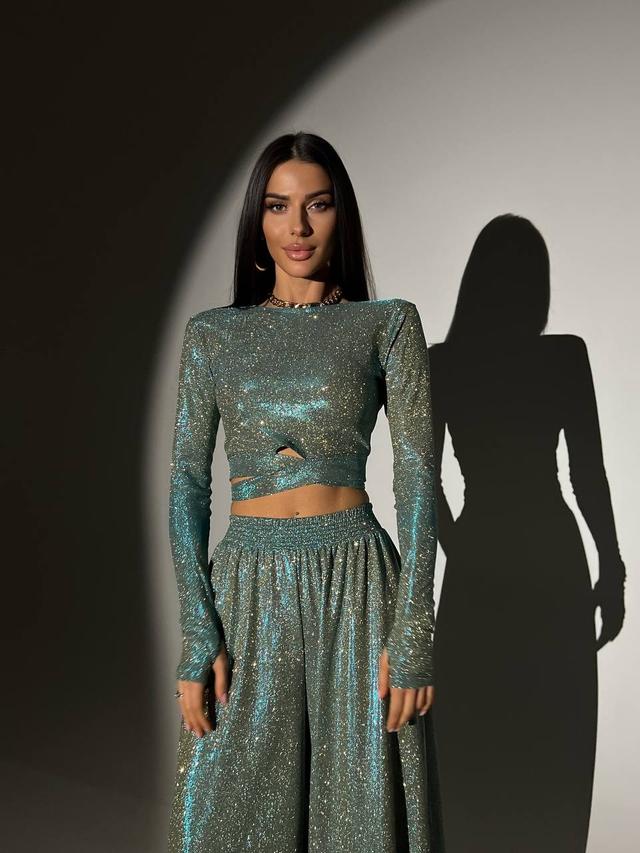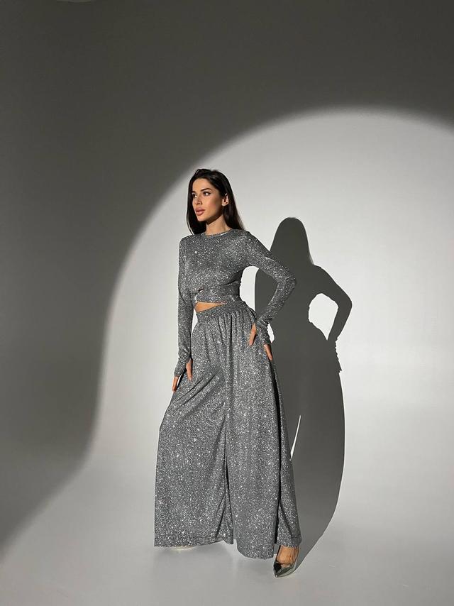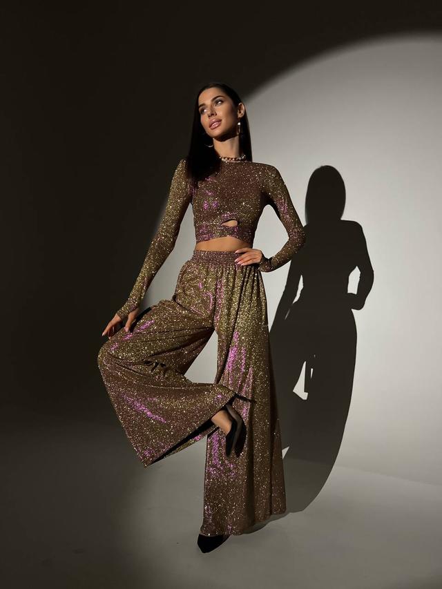 Блискучий трикотажний костюм укорочений топ і брюки кльош з люрексовим напиленням Dvk5498