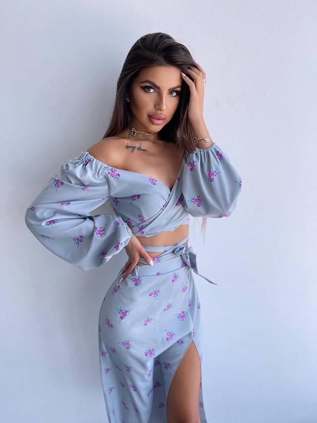Квітковий комплект: топ із зав'язками на талії + спідниця міді з розрізом.