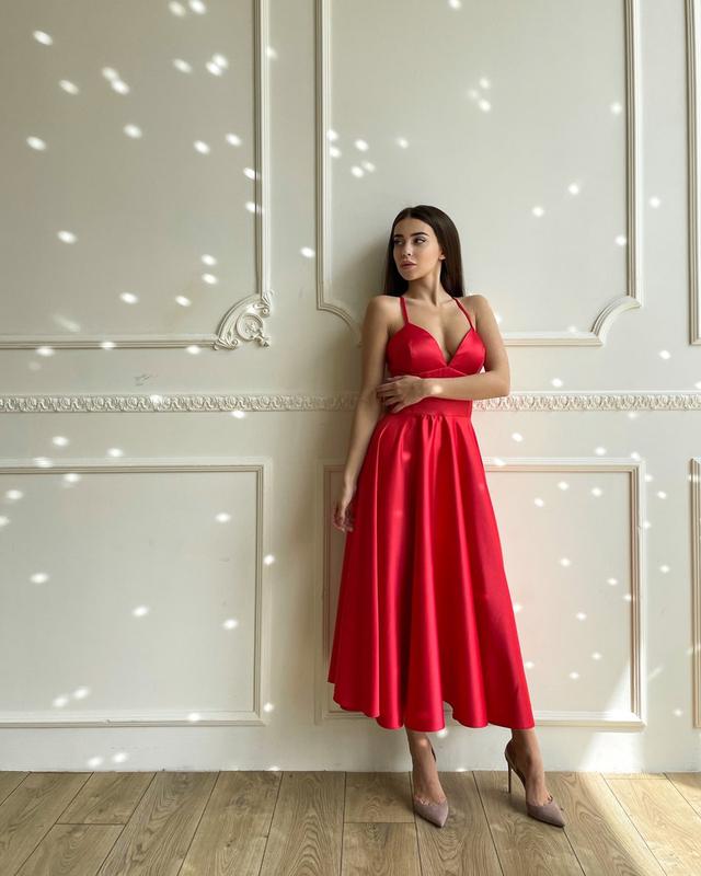 Вечірня жіноча сукня міді з корсетним ліфом та пишною спідницею з королівського атласу Sms8404