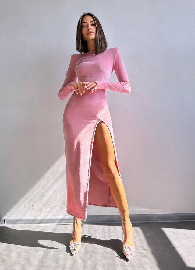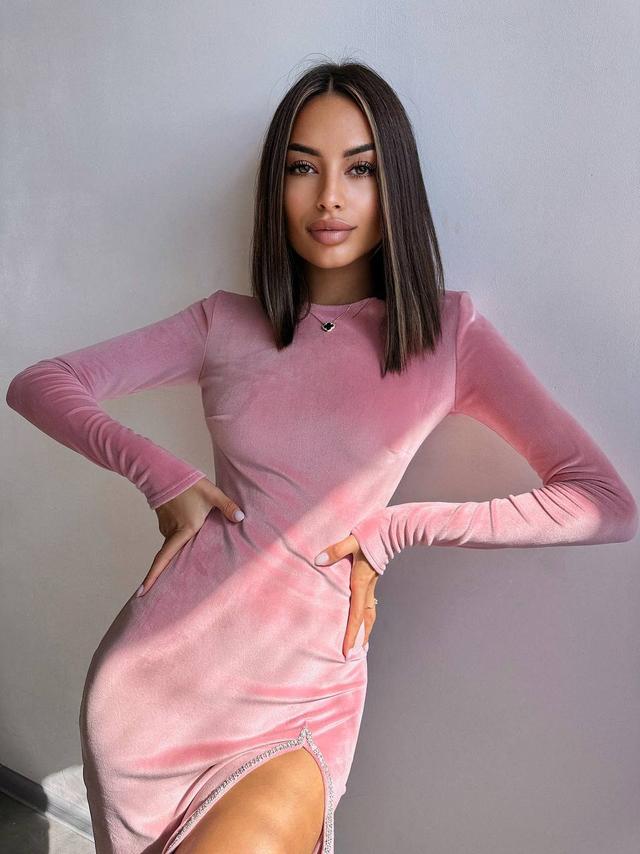 Шикарна жіноча оксамитова сукня з глибоким розрізом по нозі декорованим стразами Smb8701