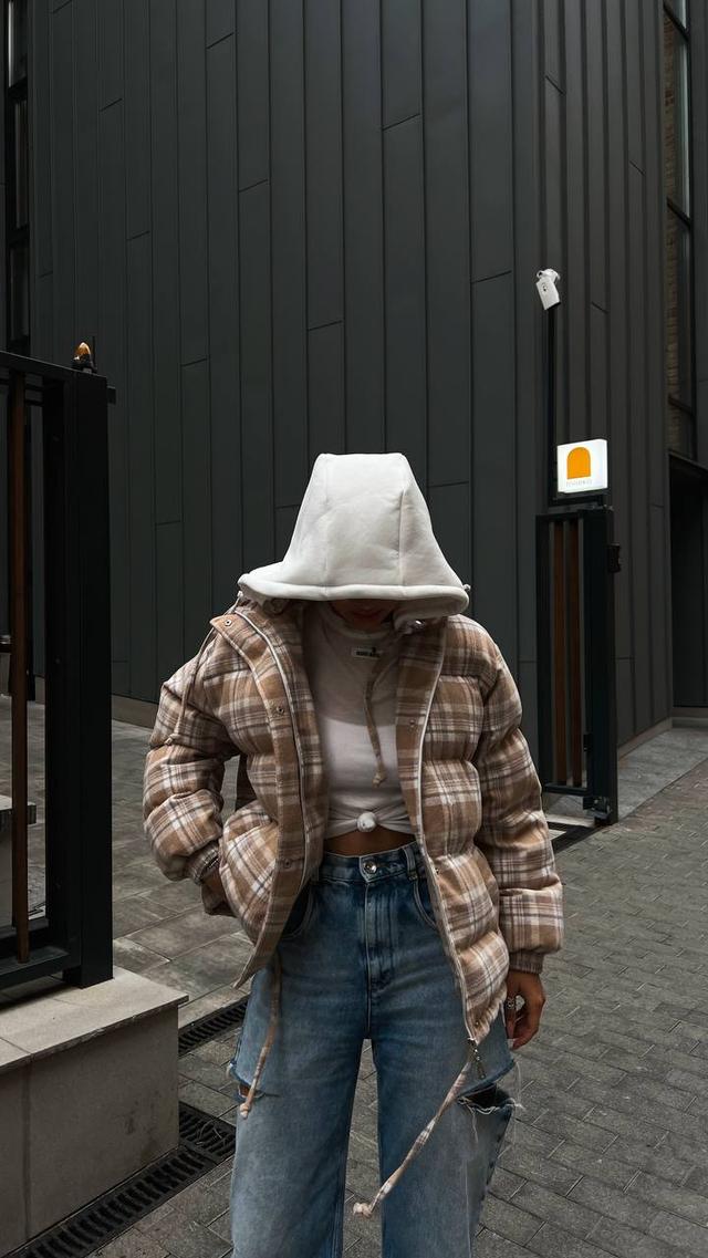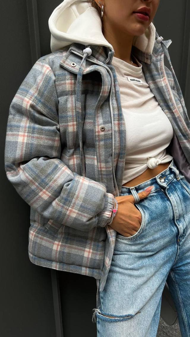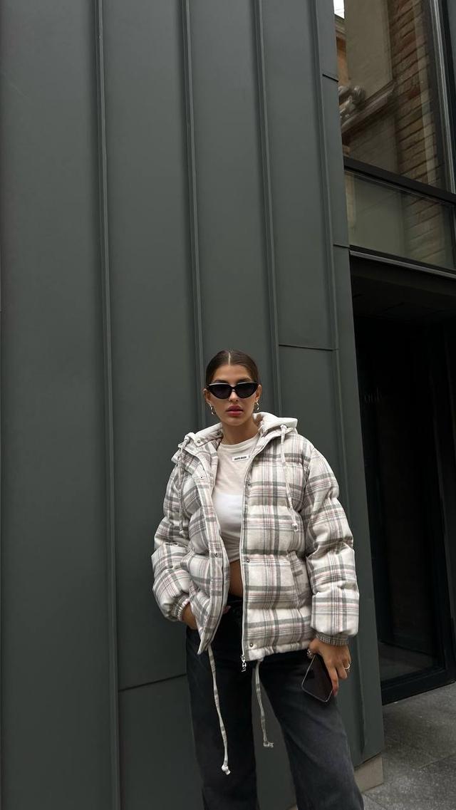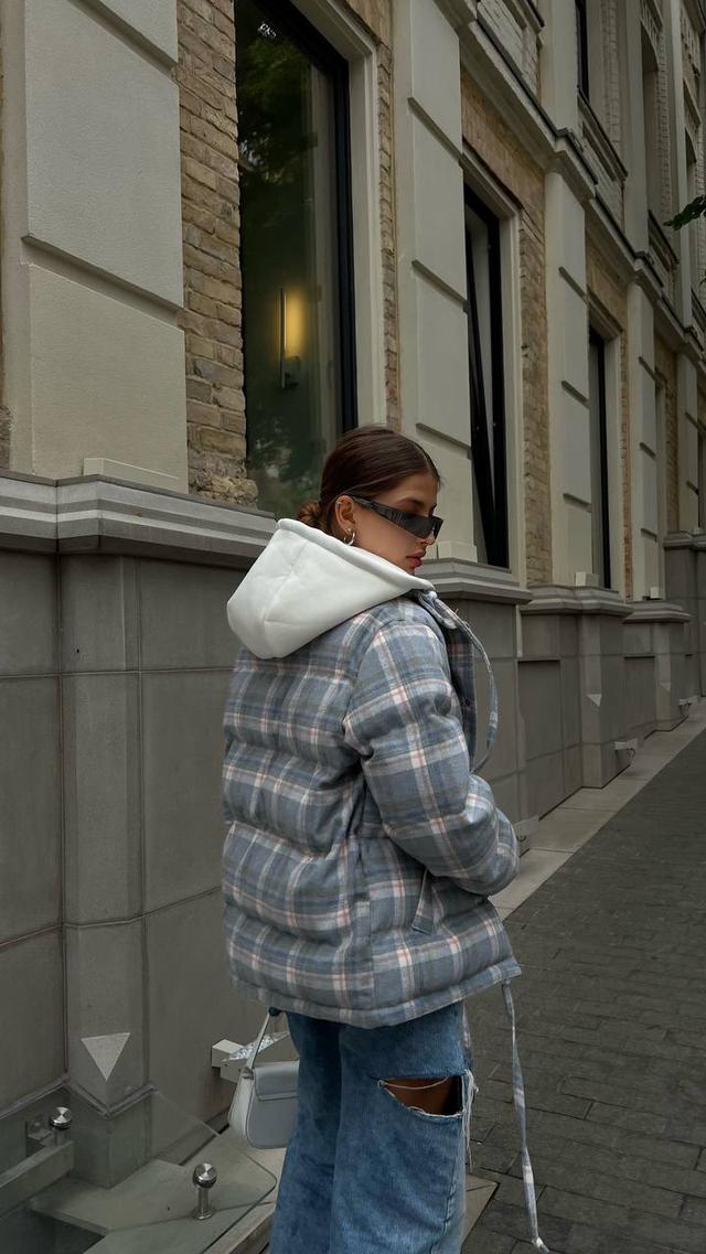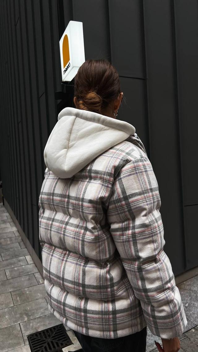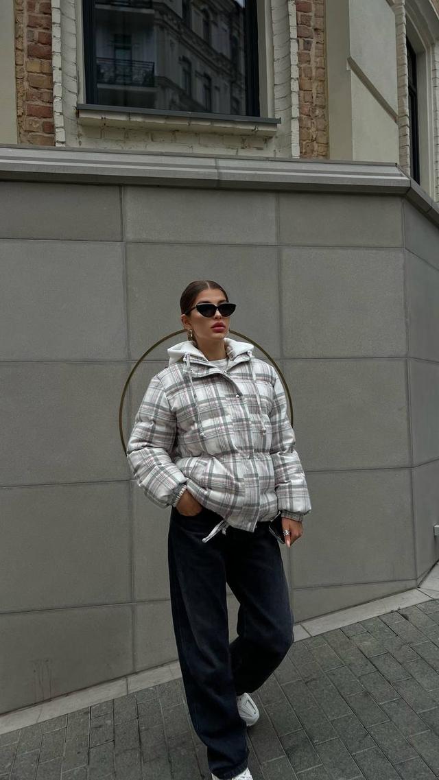 Теплий жіночий кашеміровий пуховик з капюшоном із футера трендова клітинка Gm2516