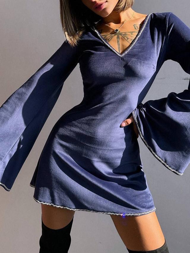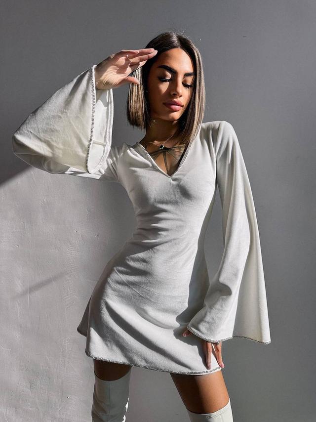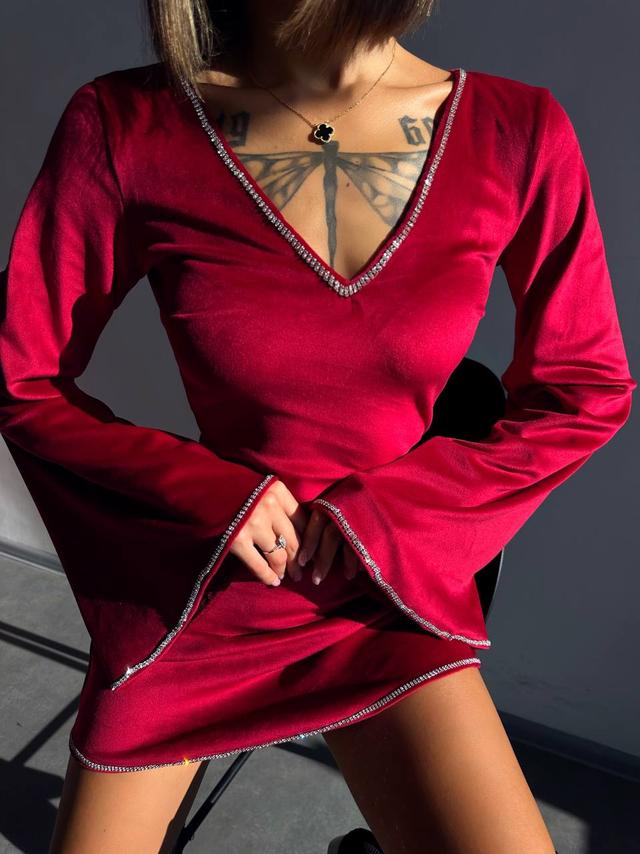 Бархатна сукня, декорована стразами з розкльошоними рукавами.