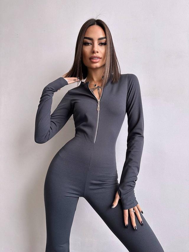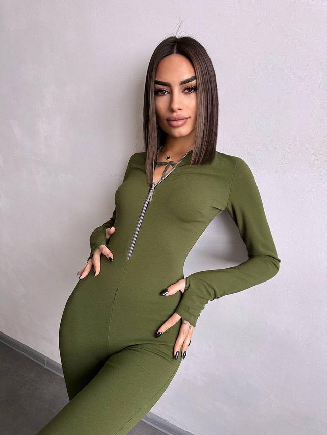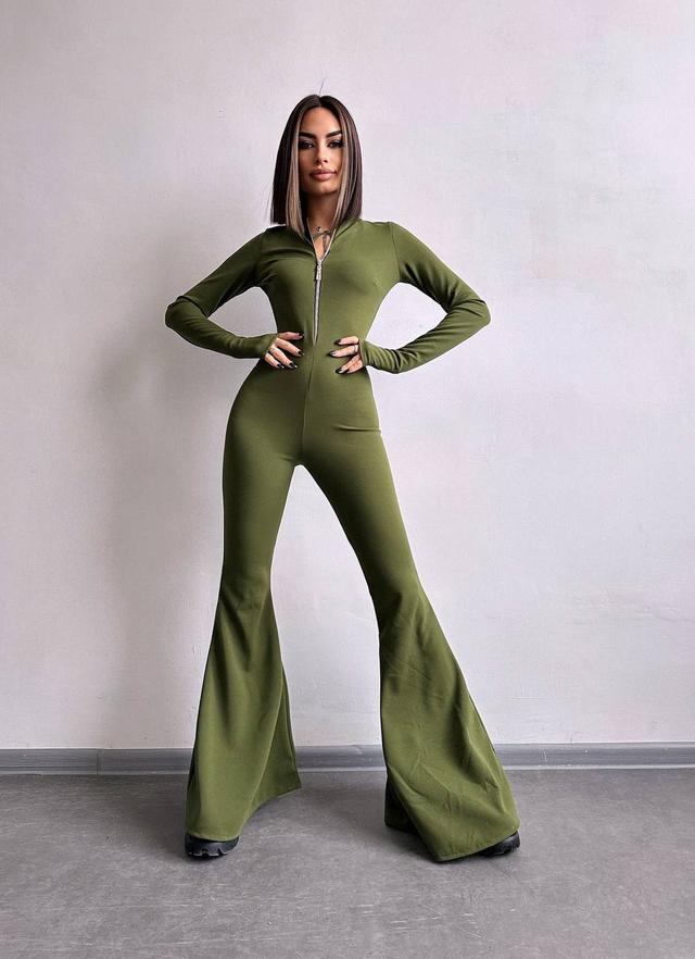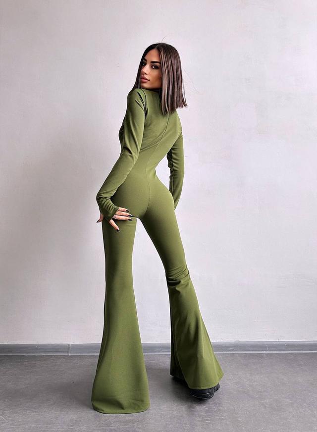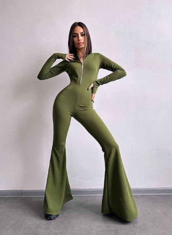 Зручний та стильний комбінезон з креп-дайвінгу. Комір-стійка, довгі рукава-мітенки, застібається на блискавку. Акцент зроблений на розкльошених від коліна брюках.