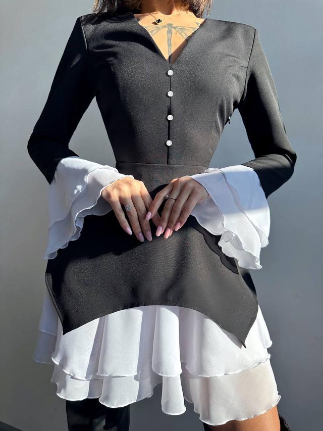 Стильна міні сукня з костюмки та шифону. Контрастний під'юбник та рукава доповнені воланами.