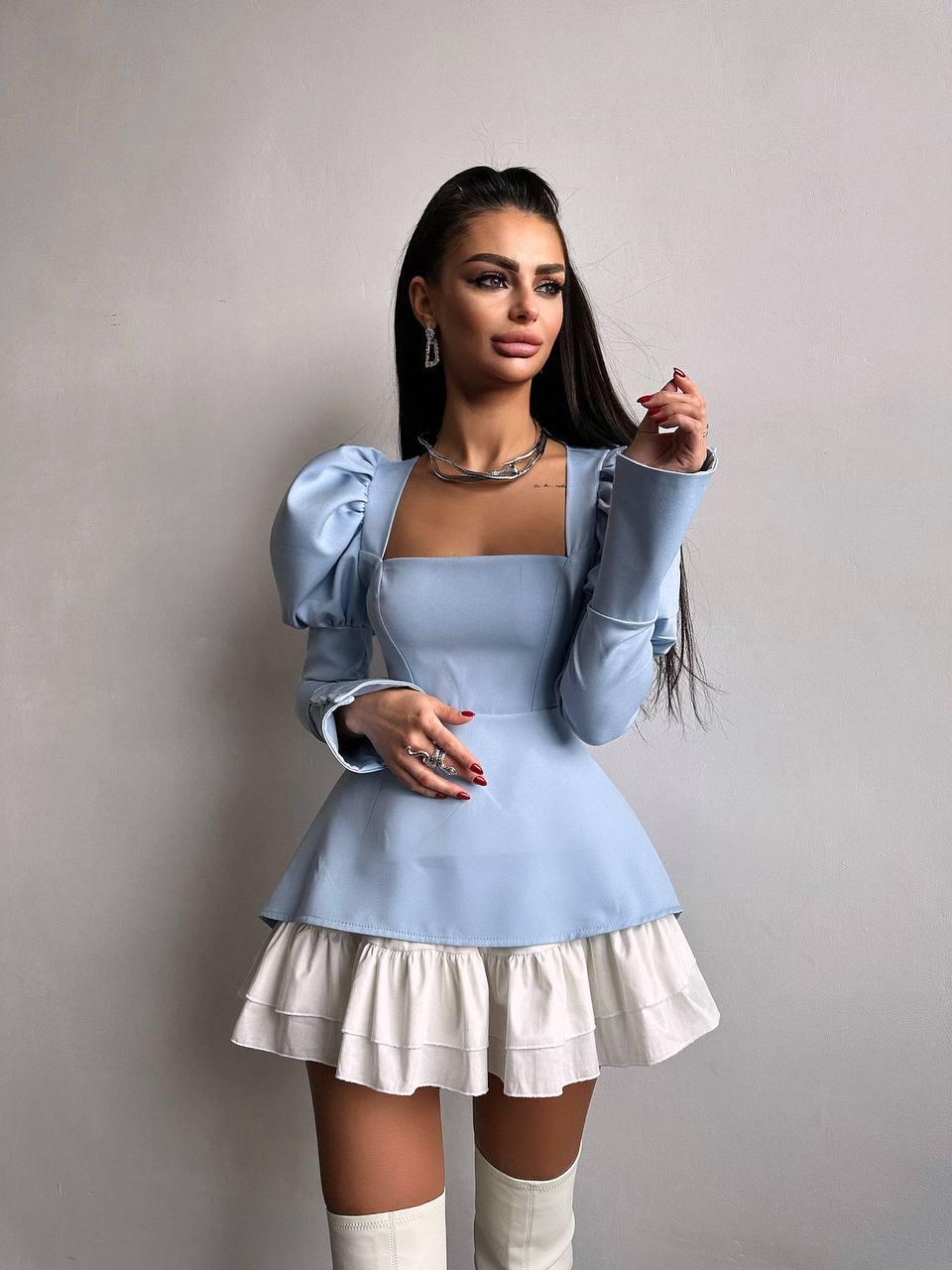 Стильна міні сукня з костюмки. Прикрашена воланами на спідниці та об'ємними рукавами-ліхтариками.