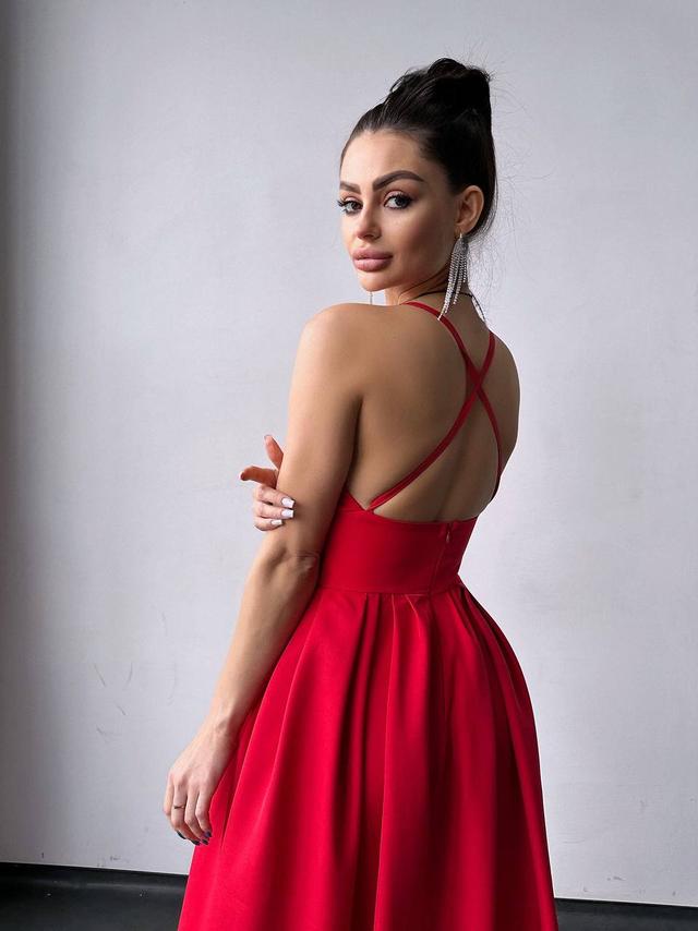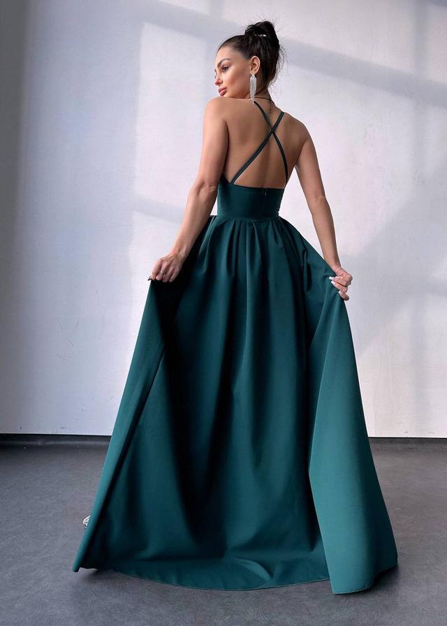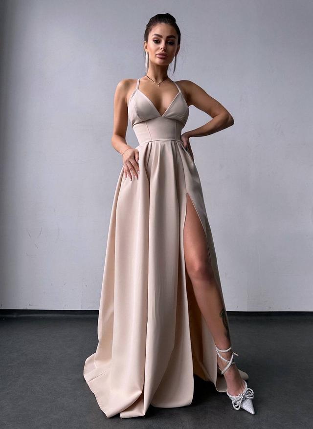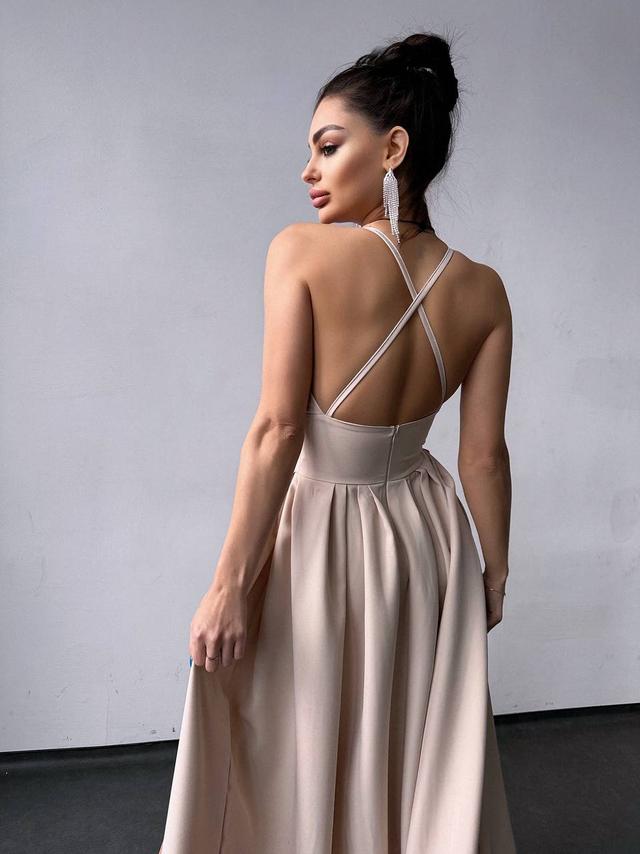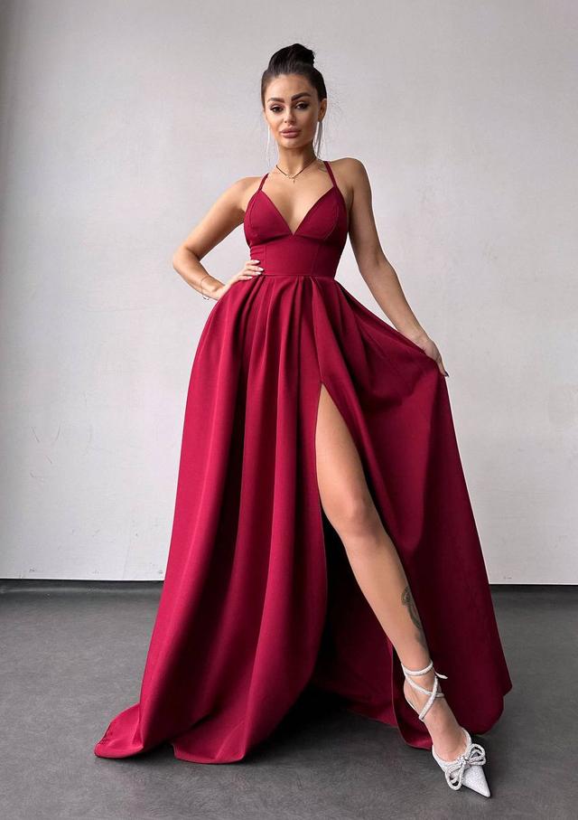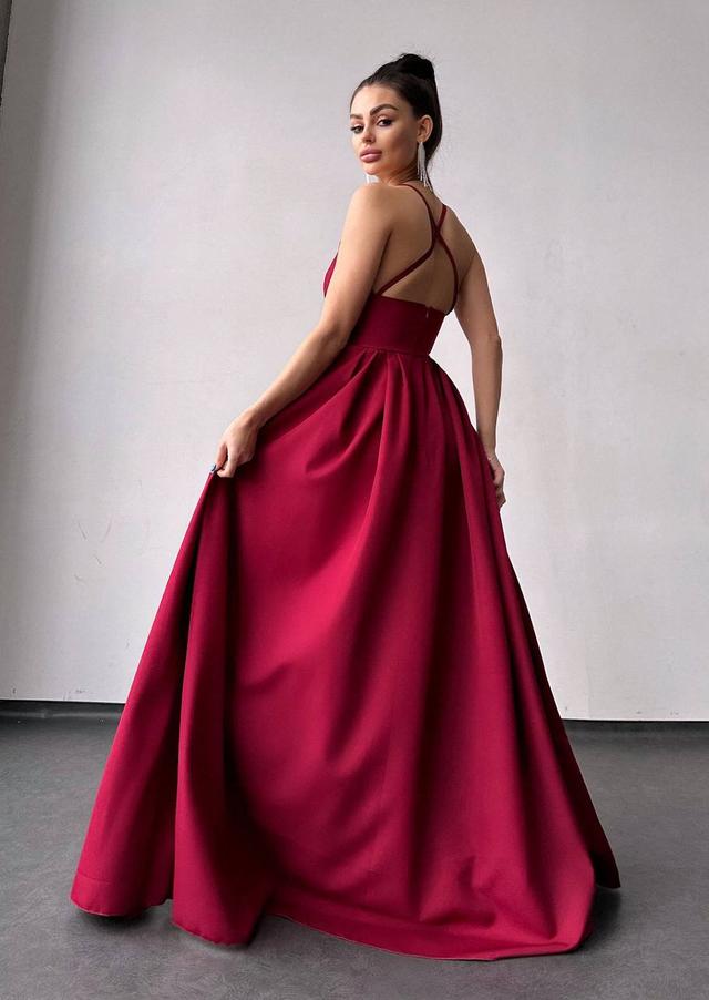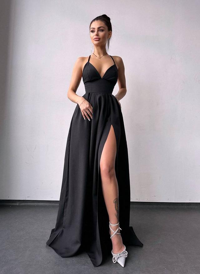 Гарна вечірня сукня в підлогу на тонких бретелях, які заходять за спину. Корсетний верх з чашками гарно підкреслює груди. Пишна спідниця з високим розрізом по нозі.