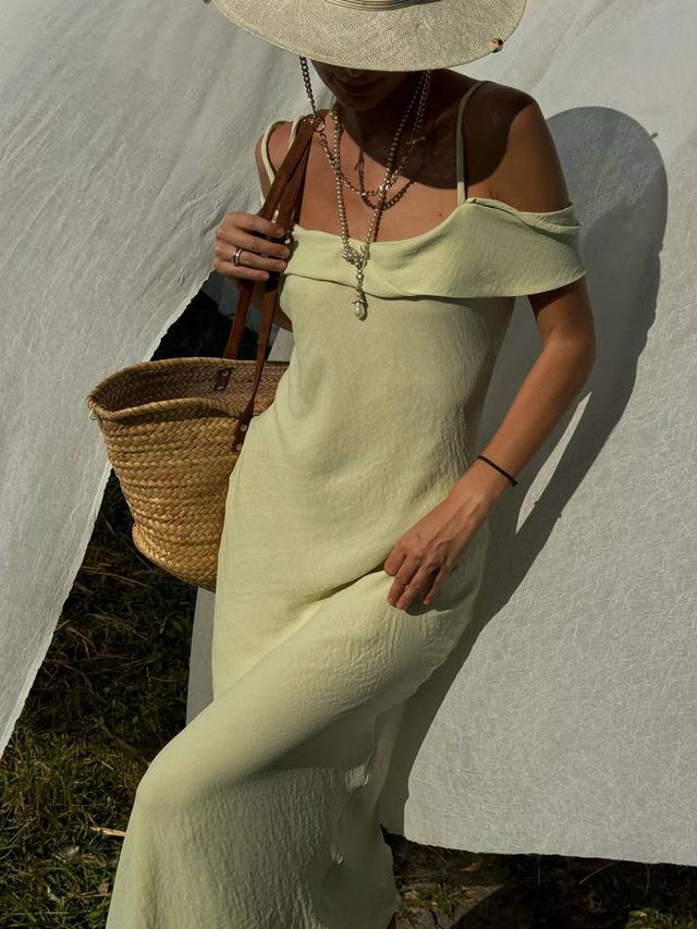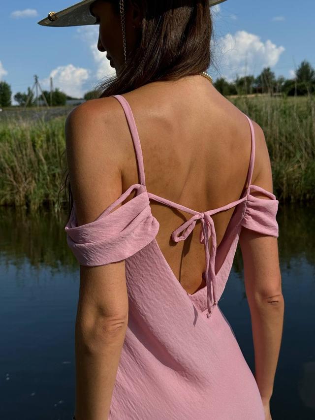 Красивий і жіночний сарафан міді з відкритими плечима та тоненькі бретелі