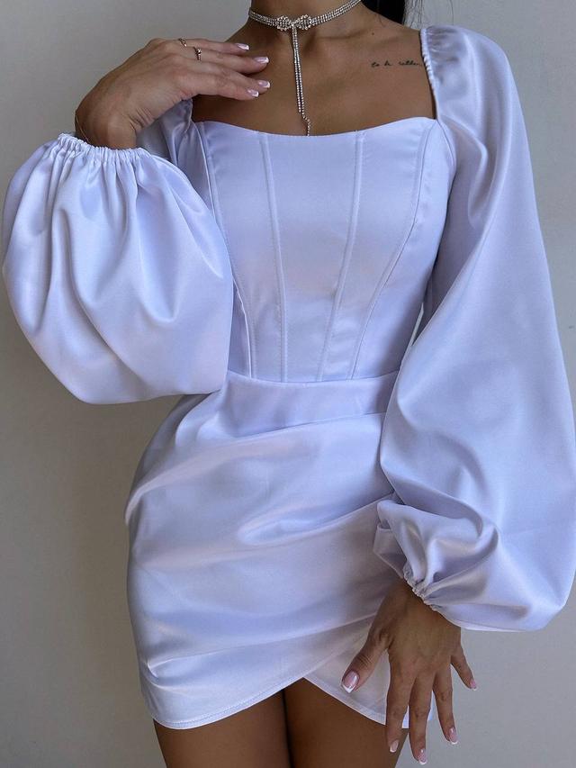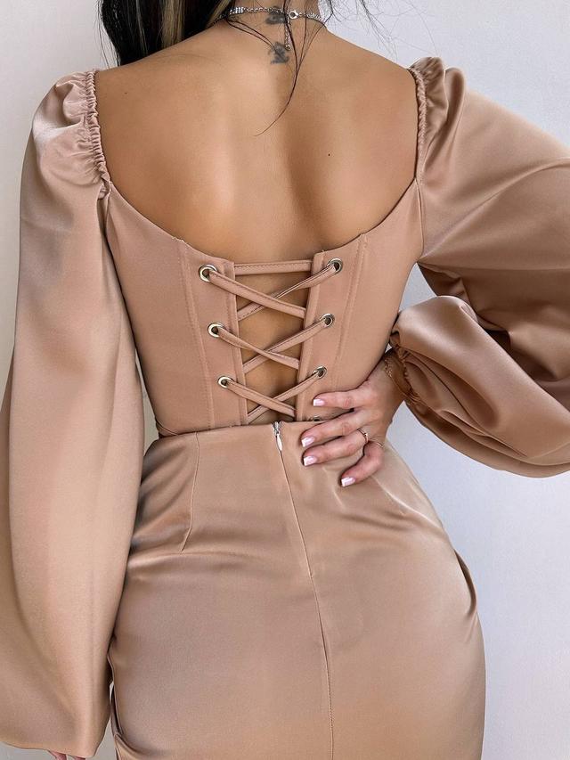 Атласна сукня з об'ємними рукавами та асиметричною спідницею. Об'ємні рукави, корсетний верх на кісточках та асиметрична спідниця з ефектом на запах.