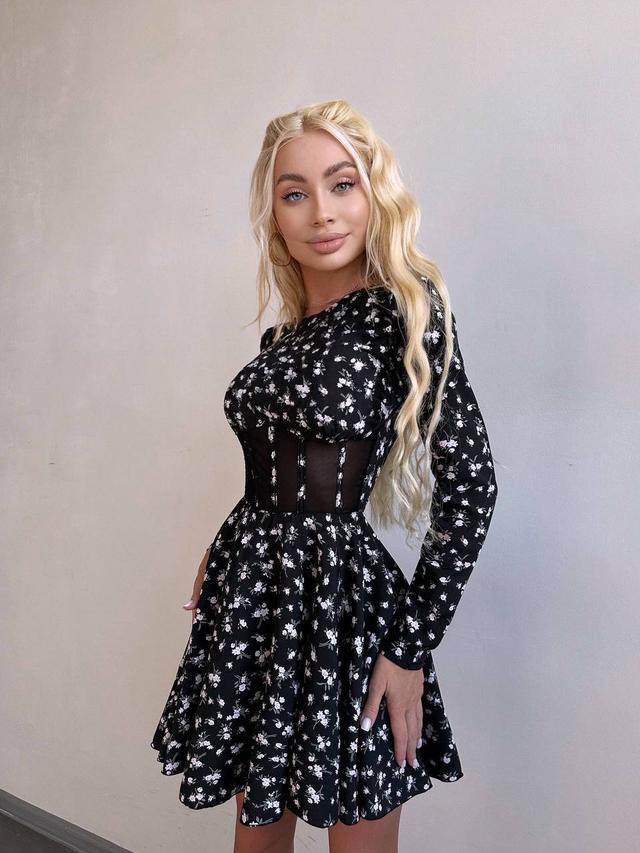 Чарівна сукня з м’якої тканини софт прикрашена ніжним квітковим принтом та корсетною вставкою, яка підкреслює талію. Пишна спідниця додає образу романтичності та легкості.